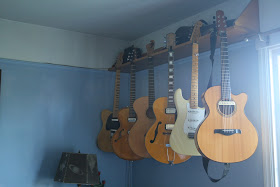 displays on flat screen monitors, two guitars sat forlorn and lonely in the